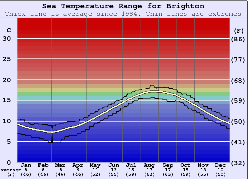The UK is again quite a unique place, in that a lot of people think that the water is cold all year around, but if you look at the chart below from surf-forecast.com you can see that it ranges from around 5 degrees in winter months all the way up to 19 degrees in the summer months.